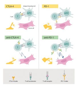 Por su parte, Tasuku Honjo descubrió en 1992 una proteína que, denominada ‘proteína de muerte celular programada 1’ (PD-1) e igualmente presente en la superficie de los linfocitos T, también actúa como un ‘freno’ o inhibidor de este tipo de leucocitos –si bien a través de un mecanismo diferente de CTLA-4–. O lo que es lo mismo, actúa como un ‘punto de control –o ‘checkpoint’– inmunológico’, para evitar una activación excesiva del sistema inmunitario que pueda provocar una enfermedad autoinmune. Y como muestran los resultados de un estudio publicado en 2012, el empleo de PD-1 como diana terapéutica –es decir, el bloqueo de PD-1– resulta muy eficaz en el tratamiento frente a distintos tipos de cáncer.