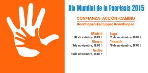 Con motivo de este Día Mundial, Acción Psoriasis celebrará desde las 18:00 horas de mañana viernes, 30 de octubre, en la sede del Ministerio de Sanidad, Servicios Sociales e Igualdad en Madrid una jornada para pacientes, familiares y personal sanitario, encuentro al que seguirán los programados en Vitoria –el próximo martes, 3 de noviembre–, Avilés (Asturias) –el 10 de noviembre–, Lugo –el 11 de noviembre– y Tenerife –el 16 de noviembre–. Para consultar los programas, ubicación y horarios de las jornadas, clica en cada una de las sedes.