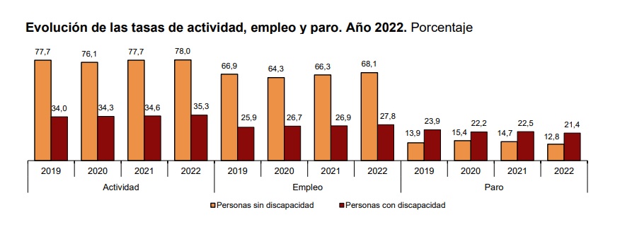 Sin embargo, el 35,3% de las personas con discapacidad legalmente reconocida eran activos, un 0,7% más que en 2021, siendo esta tasa de actividad 42,7 puntos inferior a la de la población sin discapacidad. Y, asimismo, la tasa de desempleo fue 8,6 puntos superior a la de la población sin discapacidad.