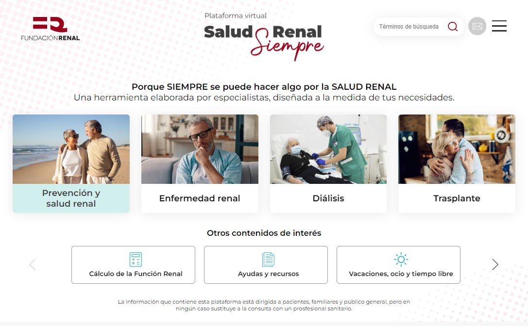 Con el objetivo de sensibilizar, educar e informar sobre la enfermedad renal, la Fundación Renal ha puesto en marcha la iniciativa Salud Renal Siempre. Esta plataforma de información ha sido diseñada con un enfoque integral y multiformato. Concentra toda la información necesaria para entender y prevenir la enfermedad renal, así como para enfrentarla de manera óptima en caso de padecerla.
