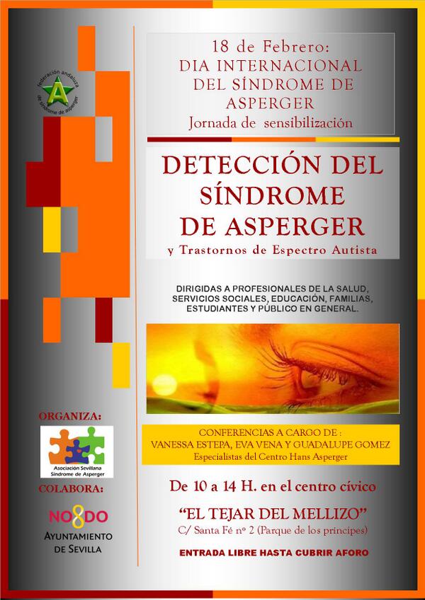La Asociación Sevillana de Síndrome de Asperger (ASSA), miembro de Somos Pacientes, celebra este martes en Sevilla la jornada de sensibilización ‘Detección del Síndrome de Asperger y Trastornos del Espectro Autista’ para profesionales sanitarios, trabajadores sociales, afectados y familiares. La asistencia a la jornada, que se desarrollará en el Centro Cívico ‘El Tejar del Mellizo’ –c/ Santa Fe, 2  desde las 10:00 horas, es totalmente libre y gratuita.