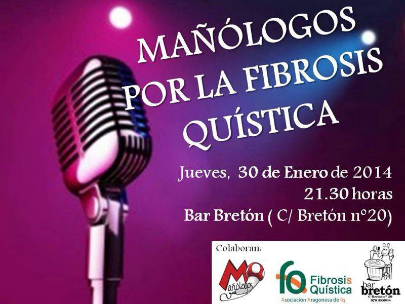 La Asociación Aragonesa de Fibrosis Quística, miembro de Somos Pacientes, organiza el próximo jueves, 30 de enero, en Zaragoza, con la colaboración del grupo de monologuistas Mañólogos, la actuación solidaria ‘Mañólogos por la Fibrosis Quística’ para recaudar fondos para sus programas de atención y cuidado de los pacientes con fibrosis quística y sus familiares.