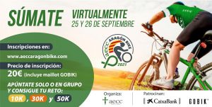 La Asociación Española Contra el Cáncer (AECC), miembro de Somos Pacientes, organiza los días 25 y 26 de septiembre y en formato virtual la primera edición de la ‘AECC Aragón Bike’, prueba ciclista solidaria para fomentar hábitos de vida saludables y recaudar fondos para sus programas de investigación y de atención y cuidado de los pacientes de cáncer y sus familiares en Aragón.