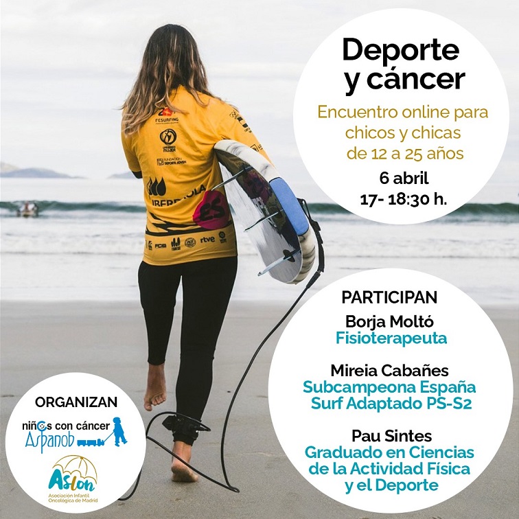 El encuentro, que se celebrará entre las 17:00 y las 18:30 horas a través de la plataforma Zoom, contará con la participación de Teresa Ferrer y Verónica Eslava, psicólogas y coordinadoras de grupos de adolescentes; Borja Moltó, fisioterapeuta; Mireia Cabañes, subcampeona de España de Surf Adaptado PS-S2 y superviviente de cáncer; y Pau Sintes, graduado en Ciencias de la Actividad Física y el Deporte, que abordarán los retos y formas de afrontar la práctica del deporte en el tratamiento y tras la enfermedad y resolverán las dudas e inquietudes de los asistentes.