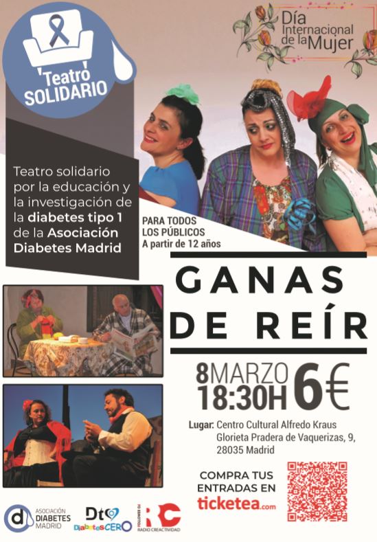 La Asociación Diabetes Madrid (ADM), miembro de Somos Pacientes, y la Fundación Diabetes Cero organizarán el próximo jueves, 8 de marzo, en el marco de la celebración del Día Internacional de la Mujer, una representación solidaria de la obra teatral ‘Ganas de reír’ para recaudar fondos para la educación e investigación de la cura de la diabetes tipo 1.