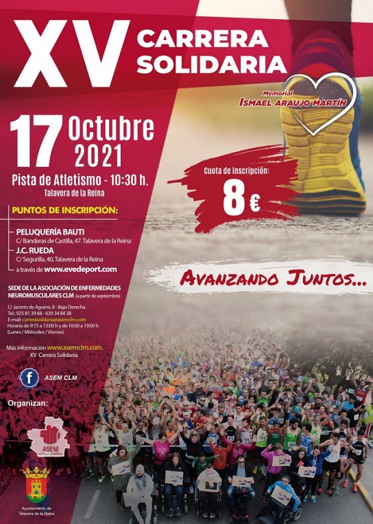 La Asociación Castellano-Manchega de Enfermedades Neuromusculares (ASEM CLM), miembro de Somos Pacientes, organiza este domingo, 17 de octubre, en Talavera de la Reina (Toledo) la decimoquinta edición de su Carrera Solidaria ‘Avanzando Juntos. Memorial Ismael Araujo Martín’ con el objetivo de recaudar fondos para sus programas de atención y cuidado a los pacientes con enfermedades neuromusculares y sus familiares.
