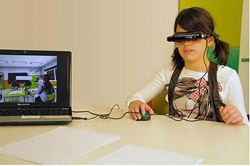 Los movimientos de la cabeza del niño son capturados por las gafas y el software actualiza la perspectiva, dando al sujeto la sensación real de encontrarse en la clase.