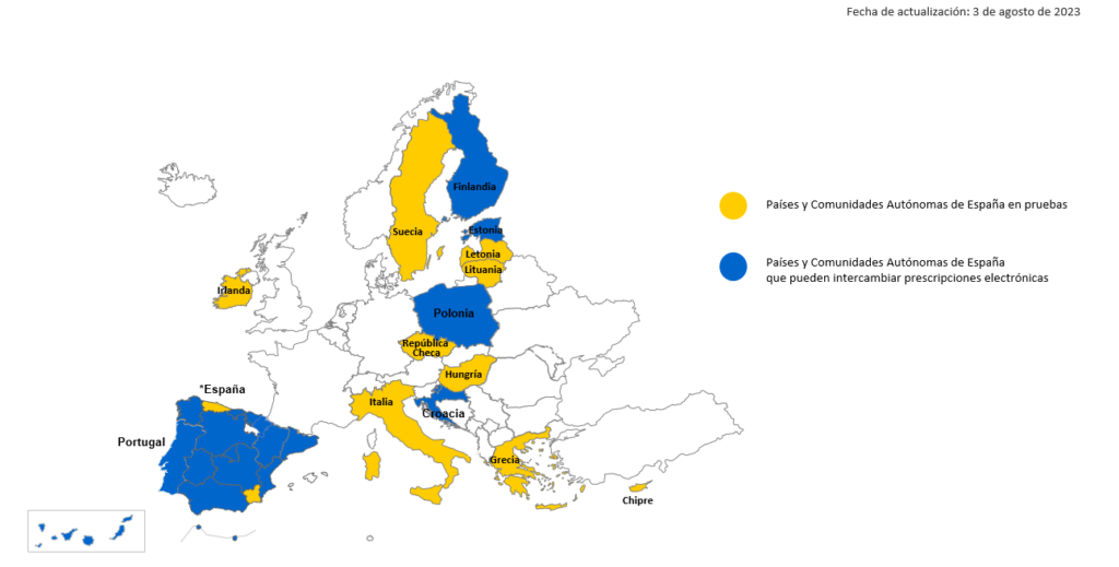En cuanto al servicio europeo de interoperabilidad de la receta electrónica, se encuentra ya activo en Andalucía, Aragón, Canarias, Cantabria, Castilla-La Mancha, Castilla y León, Cataluña, Comunidad de Madrid, Comunidad Valenciana, Extremadura, Galicia, Navarra, País Vasco, Ceuta y Melilla. Los pacientes procedentes de estas comunidades pueden obtener sus recetas en las farmacias adheridas de Croacia, Estonia, Finlandia, Polonia y Portugal. Además, está en fase de pruebas en Asturias y Murcia, así como en Italia, Grecia, Chipre, Hungría, República Checa, Irlanda, Suecia, Letonia y Lituania.