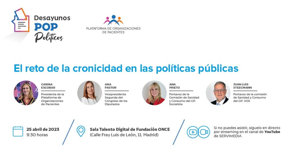 La Plataforma de Organizaciones de Pacientes (POP) organiza desde las 9:30 horas de hoy martes, 25 de abril, y bajo el título ‘El reto de la cronicidad en las políticas públicas’, una nueva edición de sus ‘Desayunos POP’, foros de debate para dar voz a los pacientes.