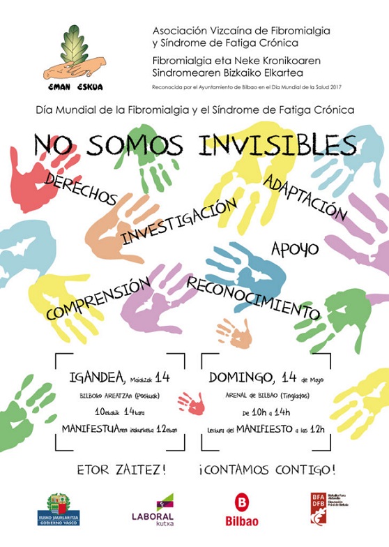 La Asociación de Fibromialgia y Síndrome de Fatiga Crónica Eman Eskua, miembro de Somos Pacientes, tras organizar las I Jornadas ‘Retos ante la Fibromialgia y el SFC’, celebrará el próximo domingo el acto central de este Día Mundial en el Arenal de Bilbao –entre las 10:00 y las 14:00 horas, habiéndose programado la lectura del Manifiesto por el Día Mundial a las 12:00 horas.