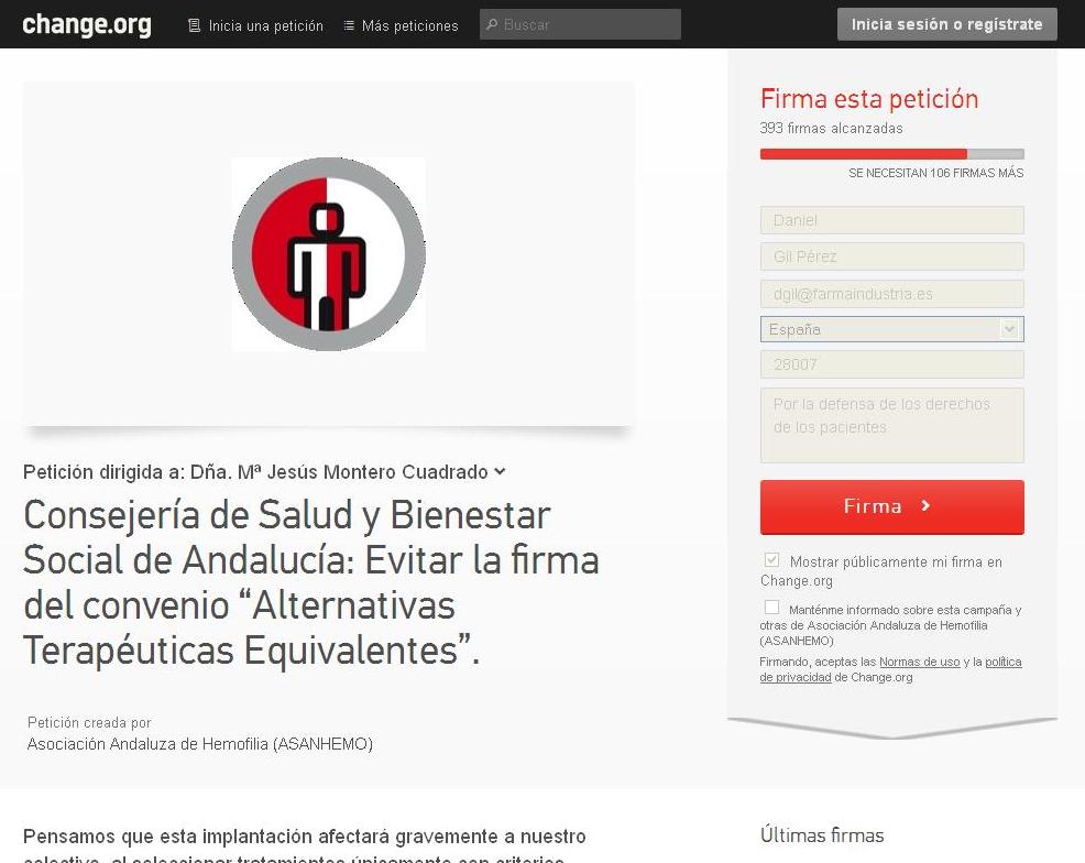 La Asociación Andaluza de Hemofilia (ASANHEMO), miembro de Somos Pacientes, ha puesto en marcha una iniciativa para la recogida de firmas a través de la plataforma Change.org en contra de las denominadas Alternativas Terapéuticas Equivalentes (ATEs).